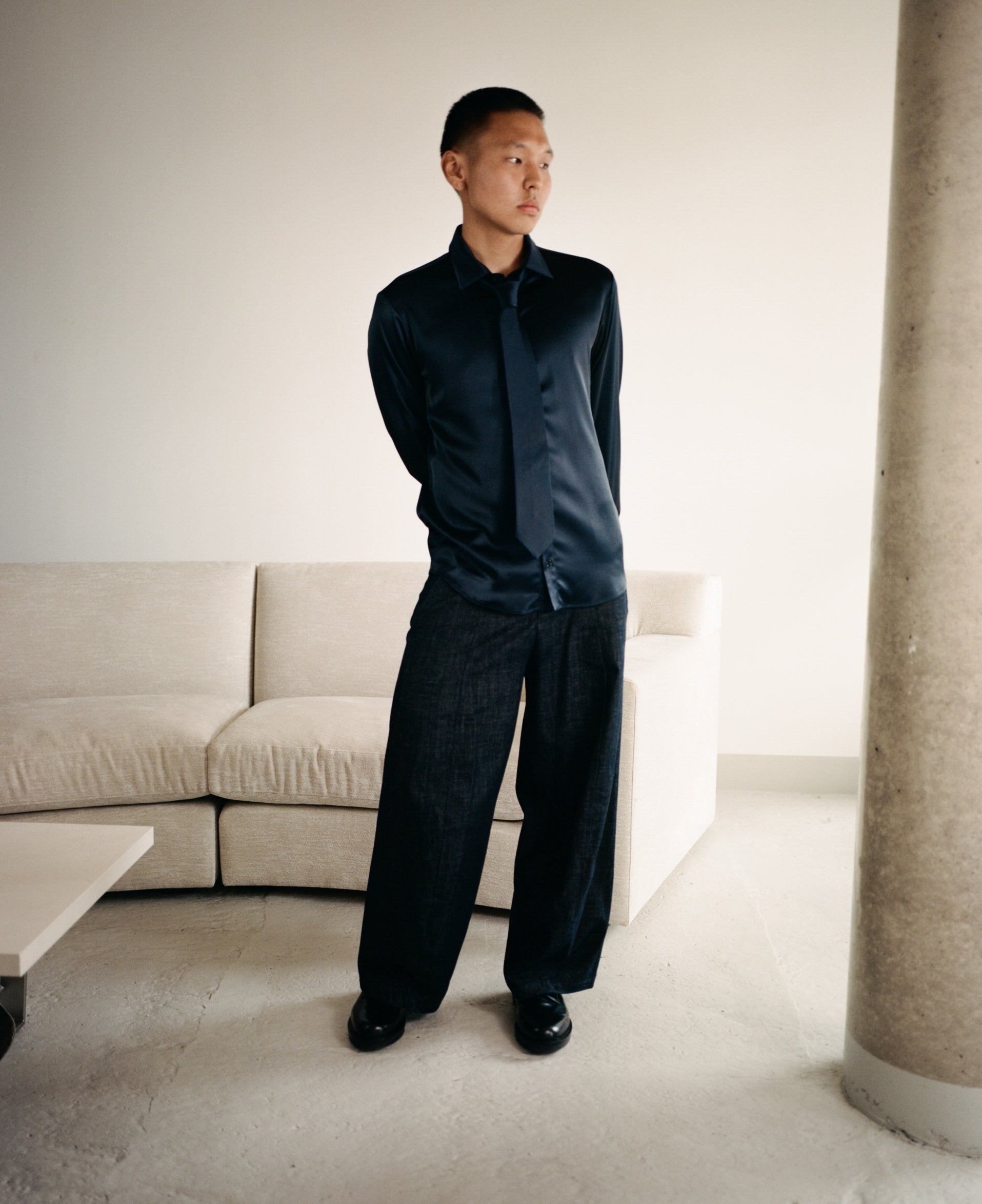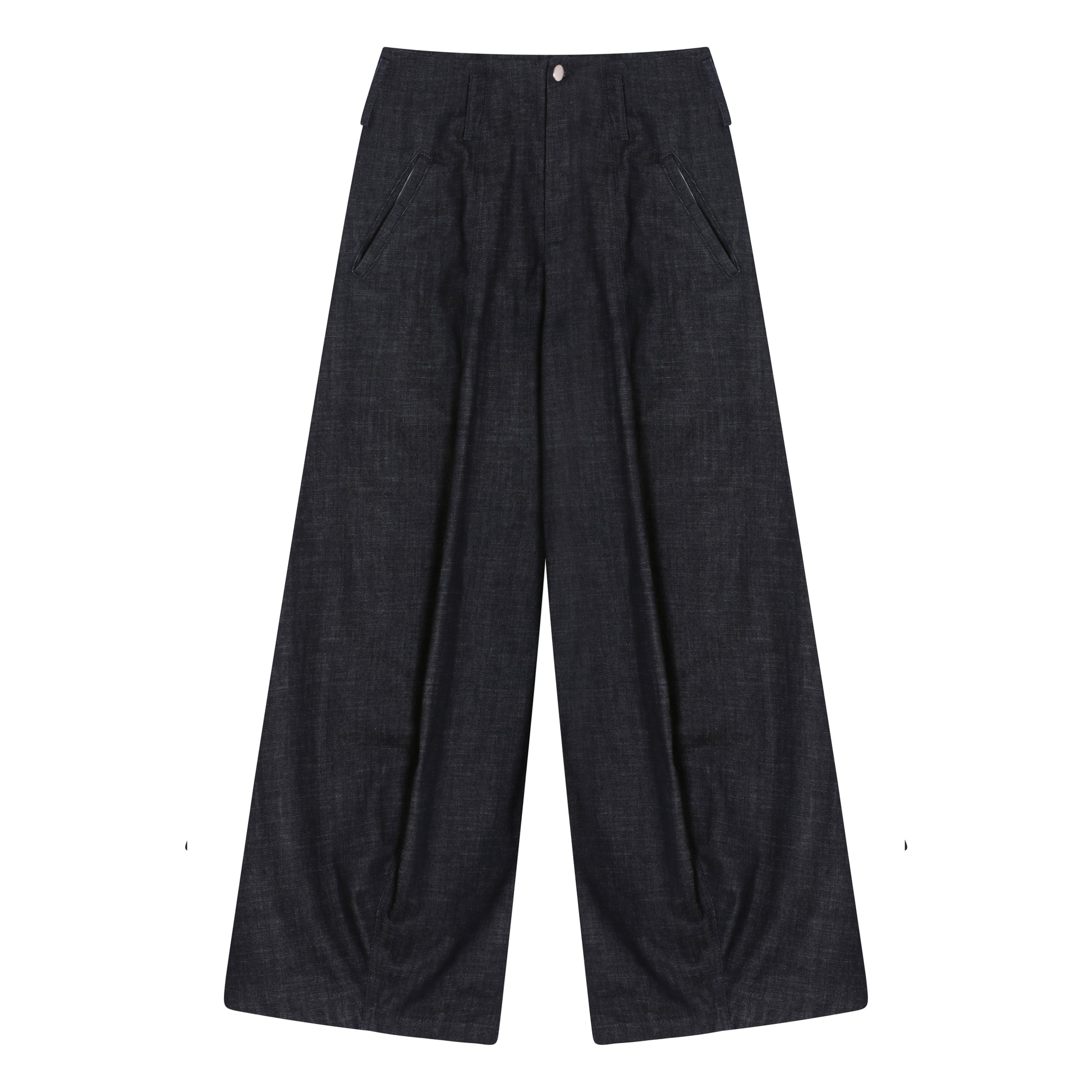 Curved leg jeans with front and back panel seams. Welt pockets, contrast pocket lining and metal button closure.