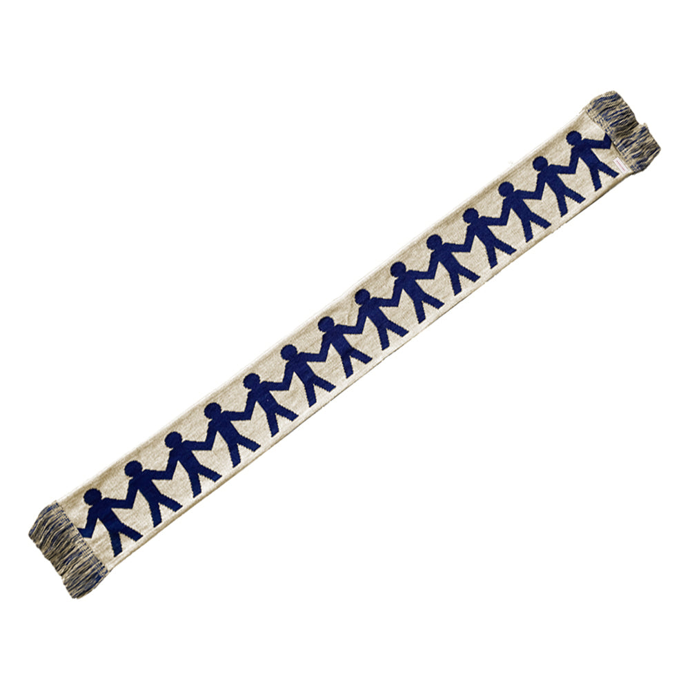Double sided knitted scarf with woven ‘Shy Bairns Get Nowt’ graphic and linked figure motif.