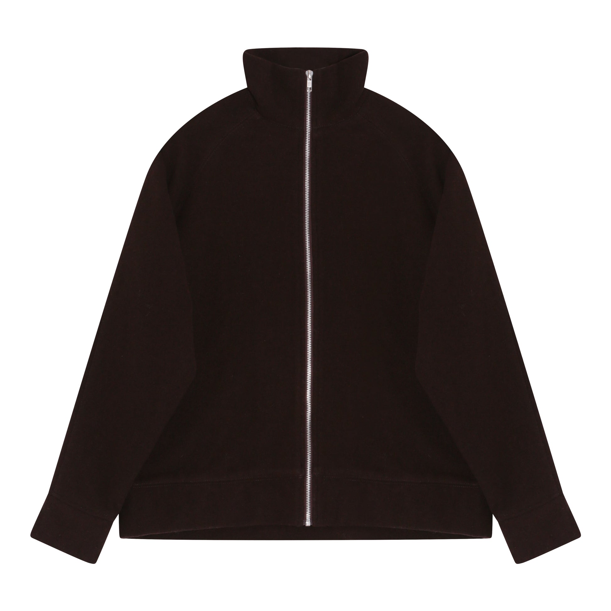 Zip-front jacket in 100% wool. Stand collar and raglan sleeves.